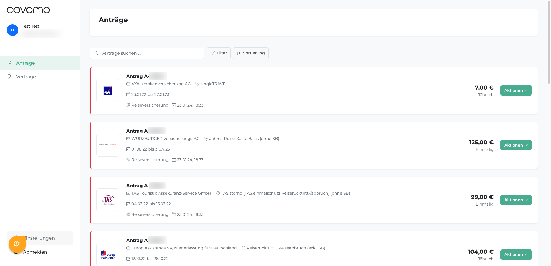 Sie sehen Anträge in Bearbeitung, angenommene, abgelehnte und widerrufene Anträge – je nachdem, welche Status von Covomo und den Versicherern bereitgestellt werden. - Keine anderen Personen