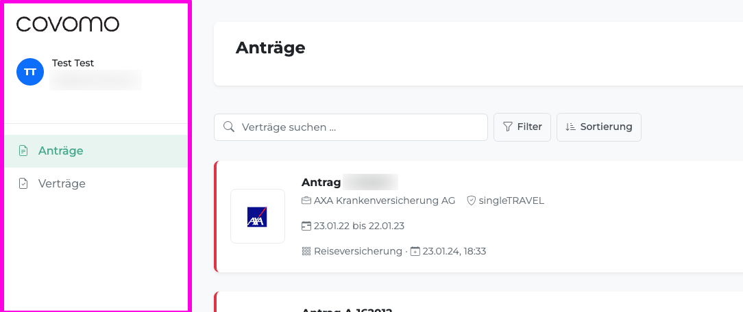 - Suchfeld – durchsucht Anträge/Verträge (z. B. Versicherer, Produkt, Nummer)
