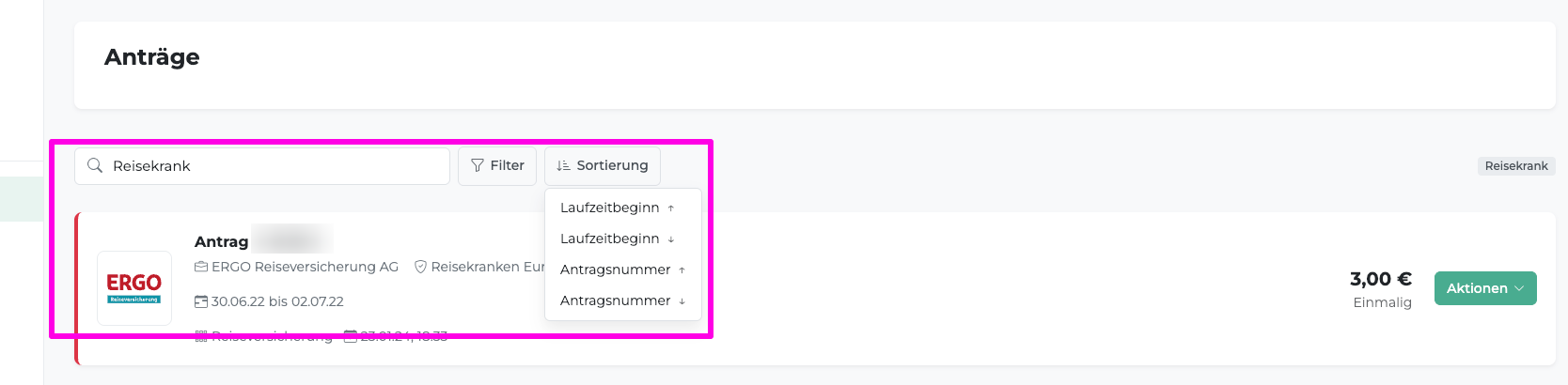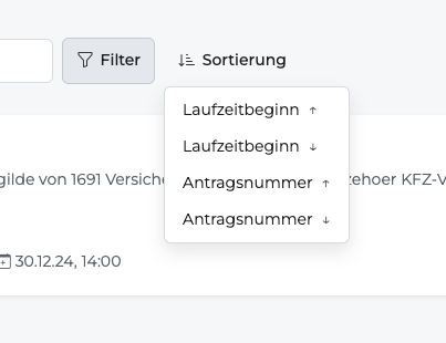 - Die gewählte Sortierung gilt für die aktuell angezeigte Liste (Anträge oder Verträge).