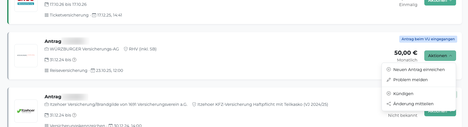 - Anträge – Liste aller Versicherungsanträge