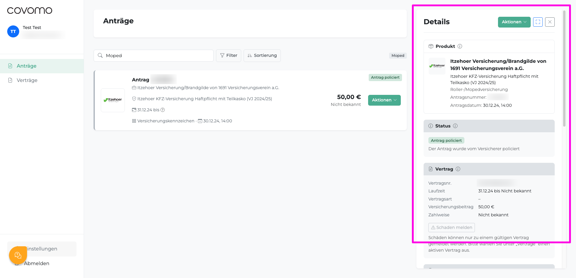 Die Detailansicht zeigt alle Informationen zu einem einzelnen Antrag oder Vertrag: Produkt, Status, Vertragsdaten, Versicherungsnehmer, Dokumente, Vermittler und Kontakt zum Versicherer. So öffnen Sie sie und kehren zurück.