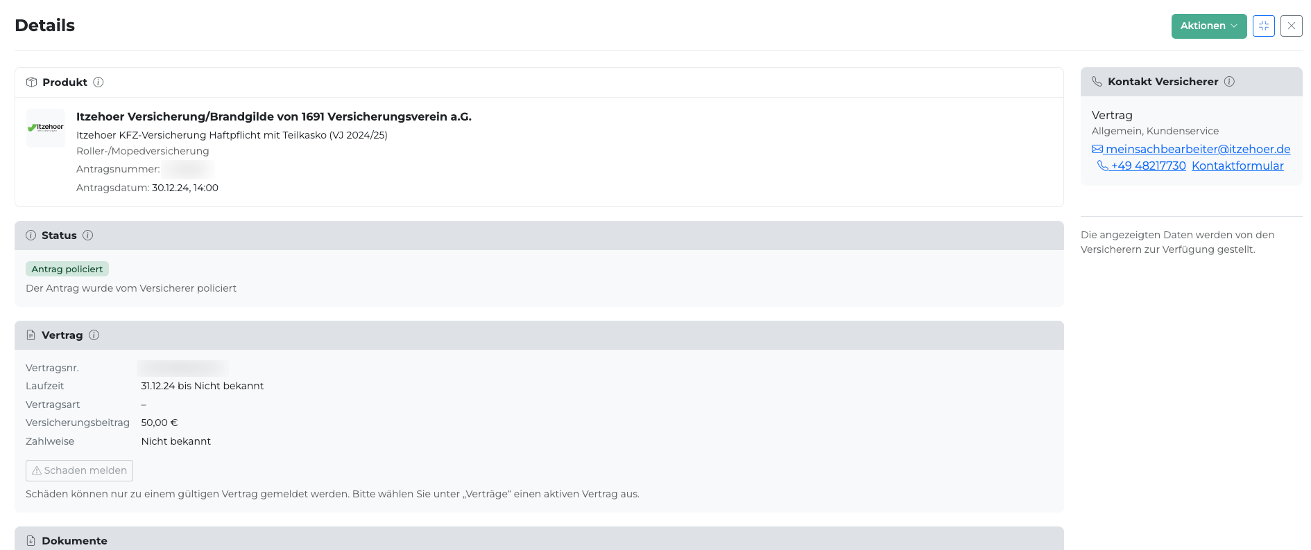 - Wichtig: Klicken Sie auf die Zeile selbst (Logo, Nummer, Versicherer, Produkt usw.), nicht auf den Button „Aktionen“ – der öffnet nur das Aktionsmenü.